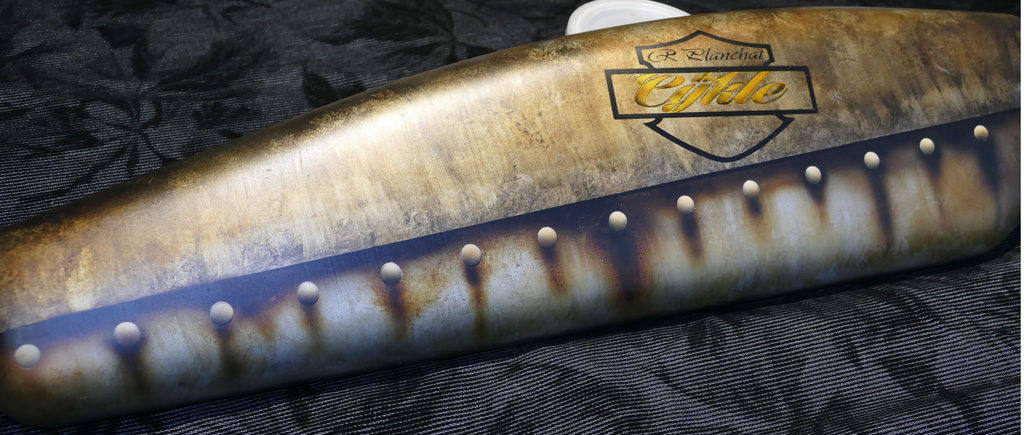 La réalisation ne fût pas simple mais intéressante car je partais de nouveau dans des effets de style tels que la tôle rouillée , rivets usés et dégoulinants de rouilles.il me fallait accentuer ces effets là que j’avais dèjà réalisé auparavant dans des tons gris plus clairs et moins prononcés.Le noir l’ocre le orange et le gris métal dessous pour donner cet aspect de tôle rouillée s’imposait.Et enfin pour le logo avec « The Cycle » j’ai utilisé le nacré or cerclé de noir.