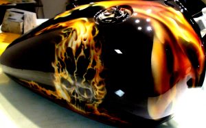 Visionnez ces photos que j’ai réalisé à l’aérographe Flaming et têtes de morts toute une histoire raconté en peinture