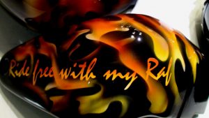 Une personnalisation à l’aérographe Le dessin choisi est une Tête de mort avec capuche « pour le petit plus élégant »et le flaming pour un effet d’enfer.